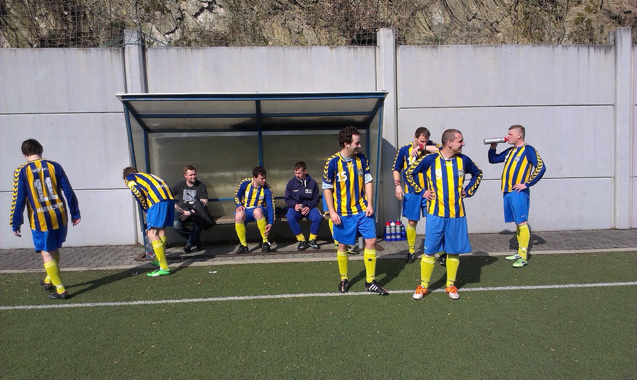 A tak začal futsalově fotbalový mač. První hrozba přišla od domácích v 5. minutě, kdy z dálky napřáhla trojka domácích M. Kotlár, ale jeho prudká střela končí metr nad pravým vinglem. O minutu později dlouhý nákop z vlastní poloviny domácích proskotačil za pozorného dohledu J. Vrány až ke koncové čáře, odkud jej domácí záložník předkládá M. Šefrovi a ten z jasné gólovky míjí. Bylo viditelné, že domácí jsou na toto hřiště prostě zvyklí a naše ojedinělá akce končí na rukavicích gólmana M. Švermy. V tu dobu nám hořela pravá strana a ze hry byl vyřazený (otrávený) střední záložník M.Tuhela. Soupeř nás přehrával přihrávkami na jeden dotek a nezvyklé teplo nám nedovolilo srovnat hru. V tu dobu dávají domácí neobsazeným hráčem gól, ale naštěstí z ofsajdu. Domácí nás přehrávali a bylo nutné zamezit jejich neustálému tlaku. Prohozením M. Tuhely a T. Kyncla a se to daří. Kynclovy spider nohy dělají problémy domácím záložníkům při rozehrávce a Michal dostal volno ke svým výpadům po pravé straně. Tento krok se později ukázal jako rozhodující pro celý zápas. Hra se vyrovnala a po dlouhém autu M. Riegera svádí souboj D. Jech a domácím P. Musílkem, který si podle zápisu připsal vlastní branku na 0:1. Škoda, lví podíl má na tomto gólu náš útočník, který o tuto trefu přišel a bude tak muset přidat nějakou jinou, aby v souboji na dálku s P. Davidem hostujícím v Desné zvítězil.